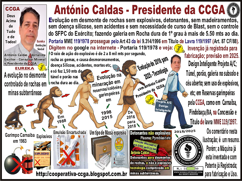 O nosso Presidente da CCGA; relata que em breve em Carnaíba, Pindobaçu na Bahia, iremos funcionar de forma Artesanal ou com o Plasma e Pyroblast, e andaremos quase 02 metros ao dia sem a subsonância da detonação, ir longe pelos poros das Rochas e estragar as esmeraldas com rachaduras e excessos de inclusões antes de chegarmos nelas nas minas subterrâneas (https://gizmodo.uol.com.br/giz-explica-efeito-explosoes). O uso do Plasma e Pyroblast serão usados em curto prazo; até que ele o Sr. António Caldas, fabrique para uso a primeira Máquina elétrica Artesanal que já inventou e que já fez o Registro de Patente Nacional e Internacional dela, Reconhecida pela Convenção da União de Berna em mais de 180 Países, conforme os relatórios ilustrativos visualizados nesta imagem gráfica abaixo: